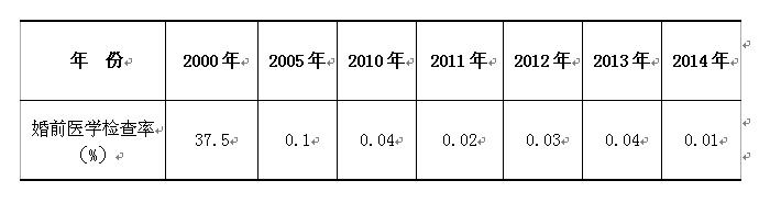 朔州市婚前医学检率持续偏低,由2000年的37.5%骤降到2014年的0.01%。新《婚姻管理条例》颁布实施后取消了婚前医学检查的硬性规定,婚前医学检查率大大减少,势必存在出生缺陷发生率提高的隐患。