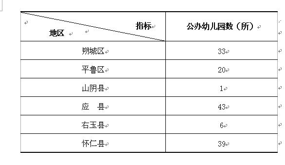 从表中可以看出,山阴县、右玉县公办幼儿园数远远小于全市24所的平均水平,所以,地区公办幼儿园及师资建设不容忽视。
