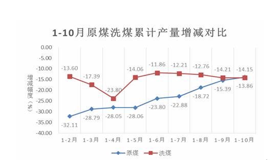 今年以来全市原煤产量跟去年同期相比,一直呈现负增长态势,但下降幅度逐月收窄,到10月份,原煤累计产量同比降幅已从年初的32.11%收窄到13.86%,下降态势有所缓解。同样,洗煤产量也呈负增长态势,1-4月降幅达到最低点23.8%,之后有所收窄,1-9月、1-10月累计降幅基本维持在14%左右。