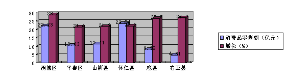 分县区看,朔城区消费品零售额22.23亿元,比上年增长28.9%;平鲁区10.83亿元,增长21.4%;山阴县11.71亿元,增长21.9%;怀仁县23.64亿元,增长22.1%;应县8.36亿元,增长26.7%;右玉县4.81亿元,增长27.2%。