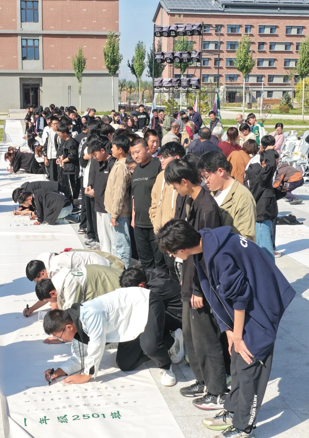 随后,全体人员移步创作现场,在百米长卷上挥毫泼墨,以三行诗的形式抒发爱国情怀。师生们或凝神构思,或挥洒自如,将心中的祖国化作笔下的诗行。创作间隙,大家品茗交流,共享文化艺术盛宴。