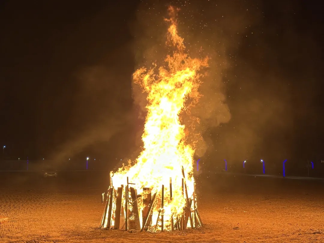 在热烈的掌声中,校领导、教师代表和学生代表共同完成点火仪式,熊熊篝火顿时照亮夜空。