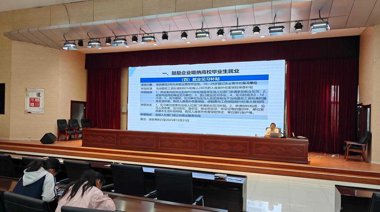 就业创业政策宣讲则聚焦毕业生最关心的实际问题:一方面,详细解读档案转递流程与人事代理注意事项,帮助学生规避毕业后的档案管理风险;另一方面,对高校毕业生就业创业补贴政策进行“全流程讲解”,从补贴发放对象、具体补贴标准,到申领程序、申领方式及申领地点,逐一清晰说明,确保政策红利直达学生群体。