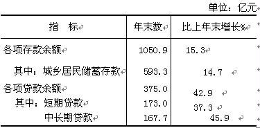 金融:年末全市金融机构本外币各项存款余额1052.1亿元,比年初增加137.3亿元,增长15.0%,其中人民币各项存款余额1050.9亿元,比年初增加139.1亿元,增长15.3%;全市金融机构本外币各项贷款余额381.3亿元,比年初增加109.5亿元,增长40.3%,其中人民币各项贷款余额375.0亿元,比年初增加112.5亿元,增长42.9%。