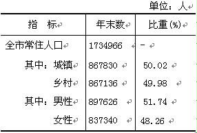 人口:据2012年人口抽样调查,年末全市常住人口为173.5万人,比上年末增加9349人。全年全市出生人口18784人,人口出生率为10.86‰;死亡人口9432人,死亡率为5.45‰;人口自然增长率为5.40‰。