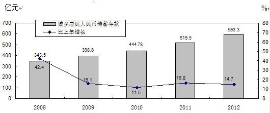 图7 2008-2012年全市城乡居民人民币储蓄存款余额及增速