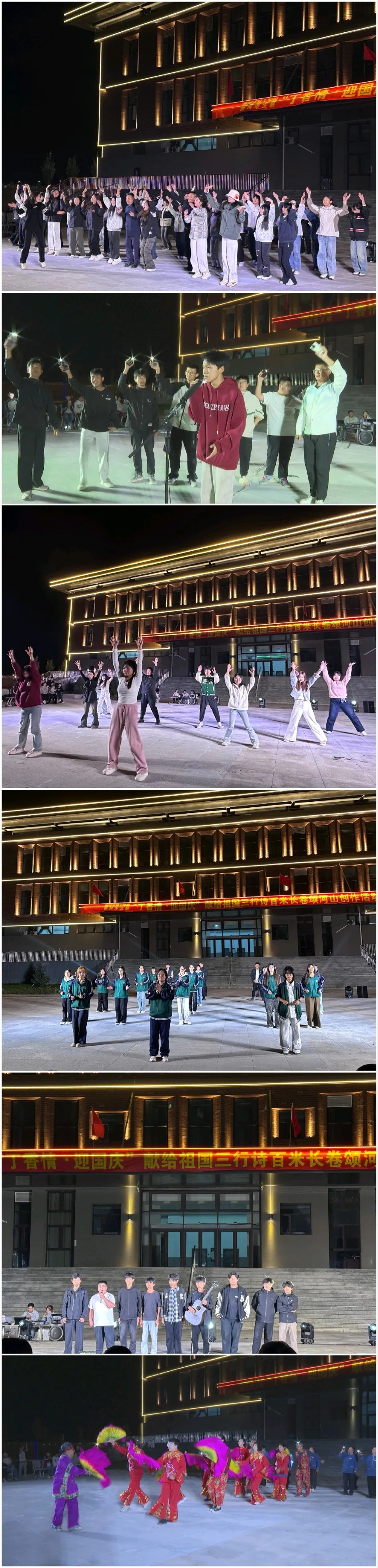 师生文艺表演精彩纷呈,歌曲、舞蹈、朗诵等节目轮番上演,展现了我校师生多才多艺的一面。晚上8点50分,全体人员齐唱校歌,歌声嘹亮,响彻云霄。